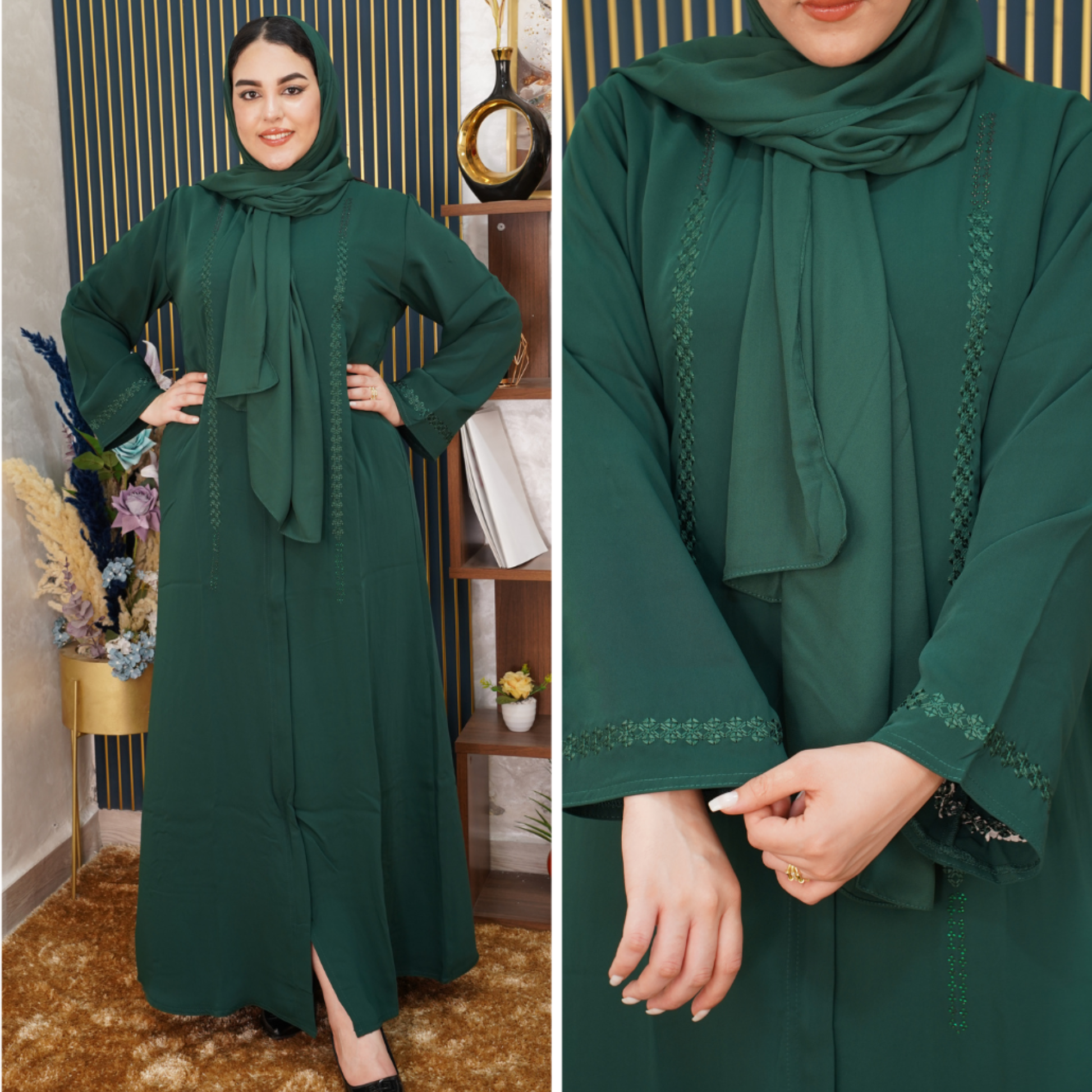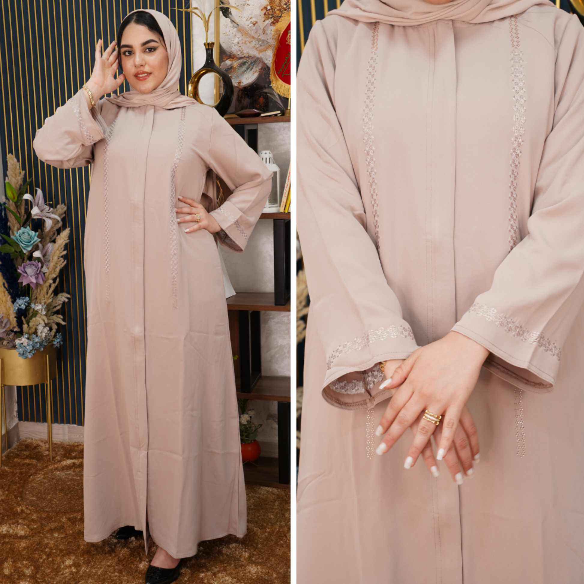 ✨ عباية إماراتية بتفاصيل فاخرة ✨ مصنوعة من توب كريب المزيان المعروف بخفته وملمسه المريح. بتطريز أنيق على الأكمام والحاشية كيمنح لمسة راقية تزيدك جاذبية وأناقة في جميع المناسبات.